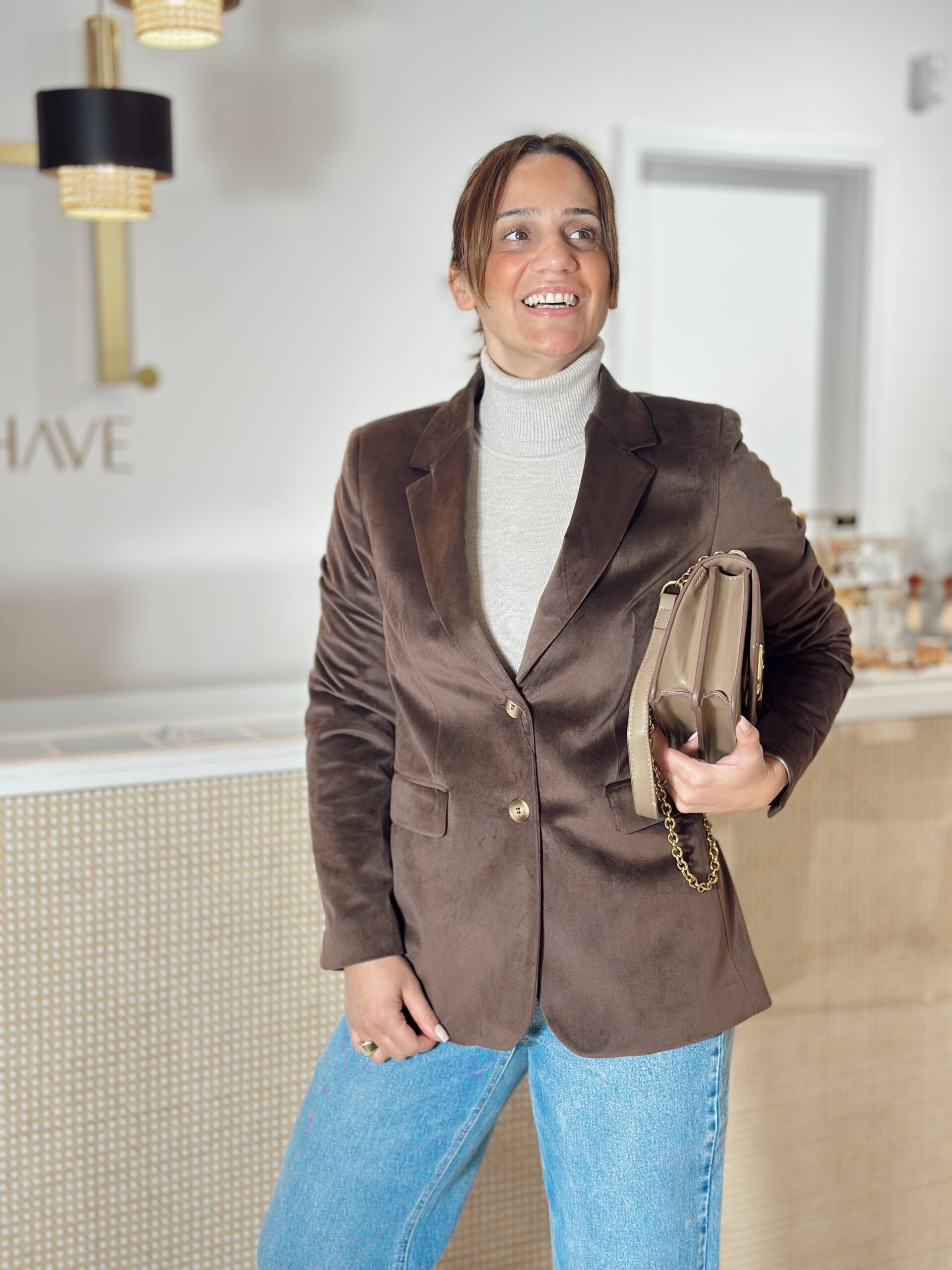 Blazer Castanho Chocolate em veludo. Macio e confortável.