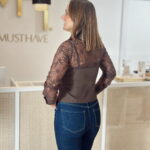 Blusa castanha com renda e aperta com botões dourados na parte da frente.