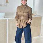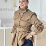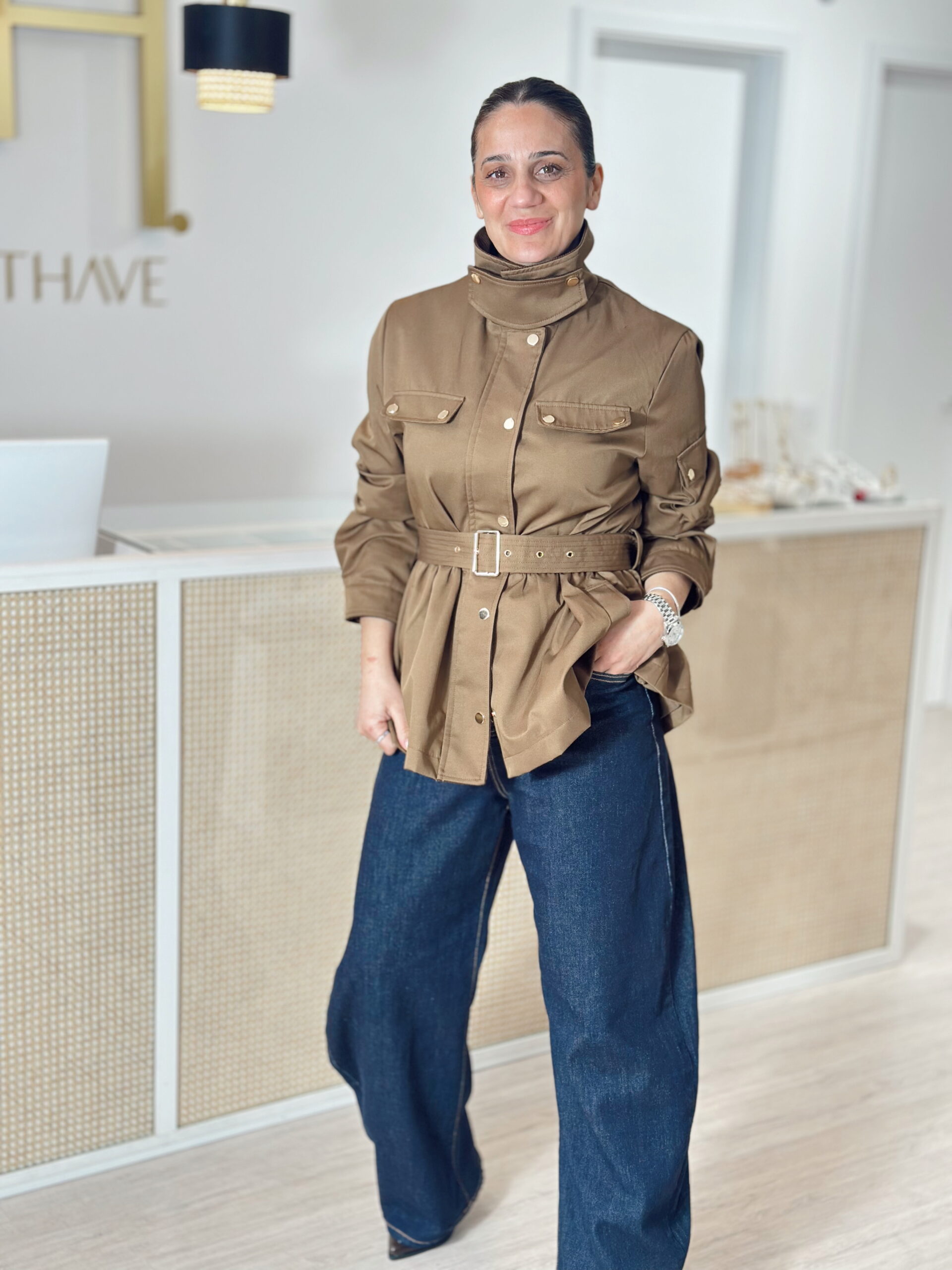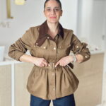 Casaco em tecido com folho na parte inferior e gola em bombazine.