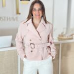 Blazer nobuck rosa, com corte cintado. Modelo forrado, com molas de efeito trespasse, bolsos laterais e cinto no mesmo tecido para ajustar a silhueta.