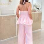 CONJUNTO DE LINHO, TOP DE AMARRAR NAS COSTAS COM EFEITO PEPLUM, ELÁSTICO NAS COSTAS. CALÇAS COM ELÁSTICO NA CINTURA.