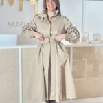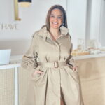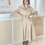 Gabardine bege escuro, com forro interior, confortável. Modelo com botões frontais, gola subida e bolsos laterais.