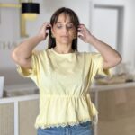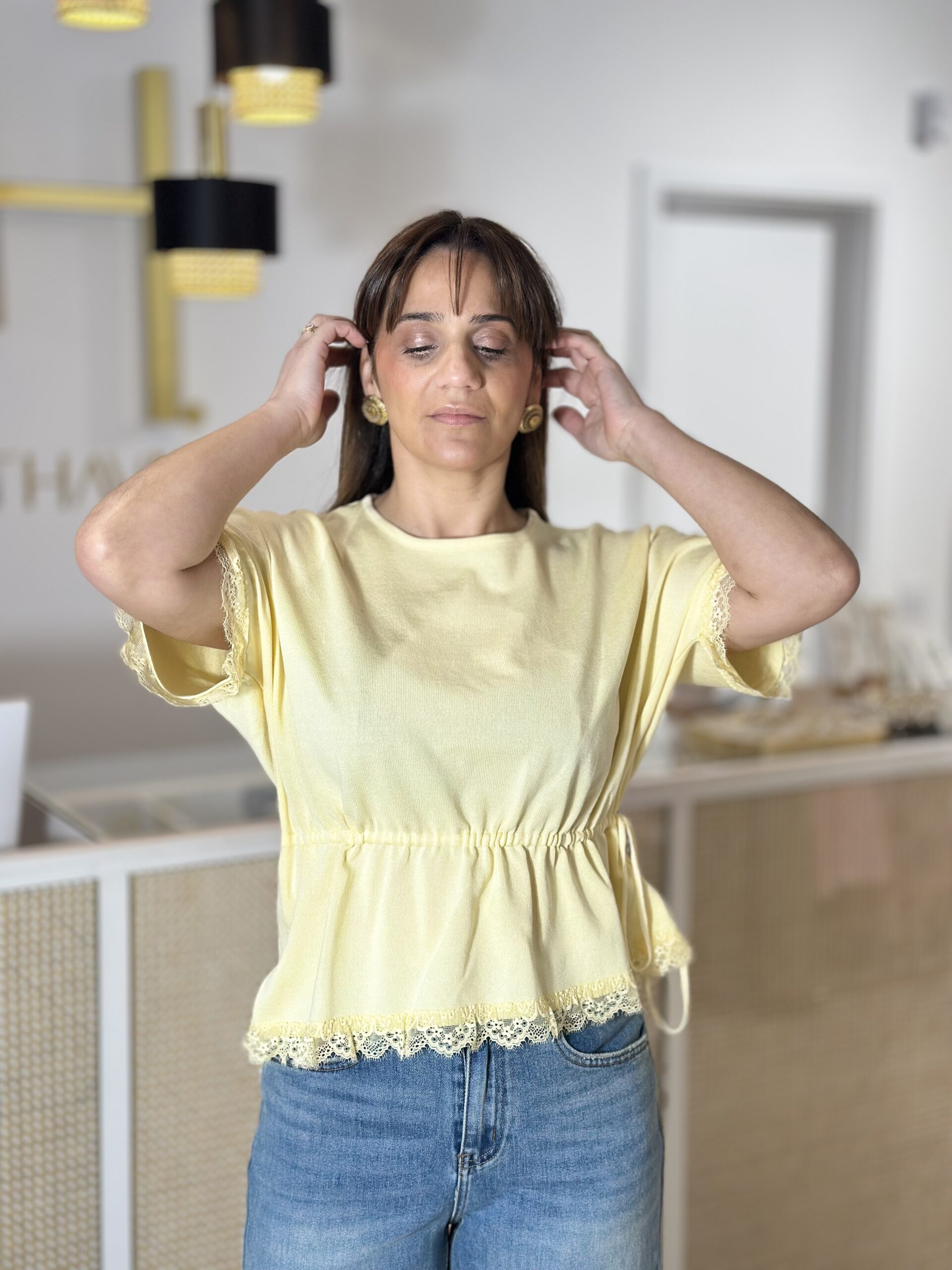 Malha com pormenores em renda nas mangas e na parte de baixo.