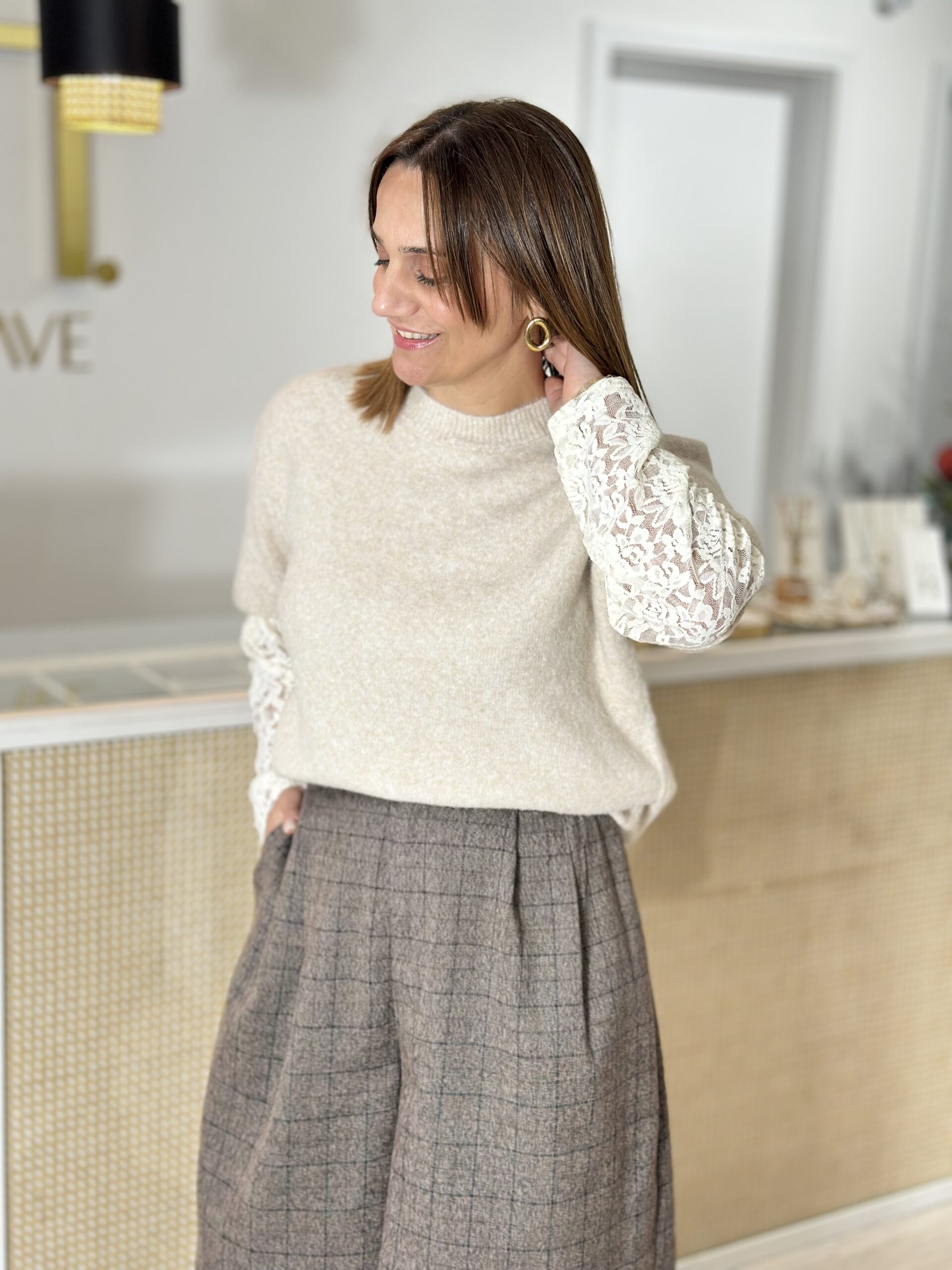 Camisola em malha com mangas em renda.