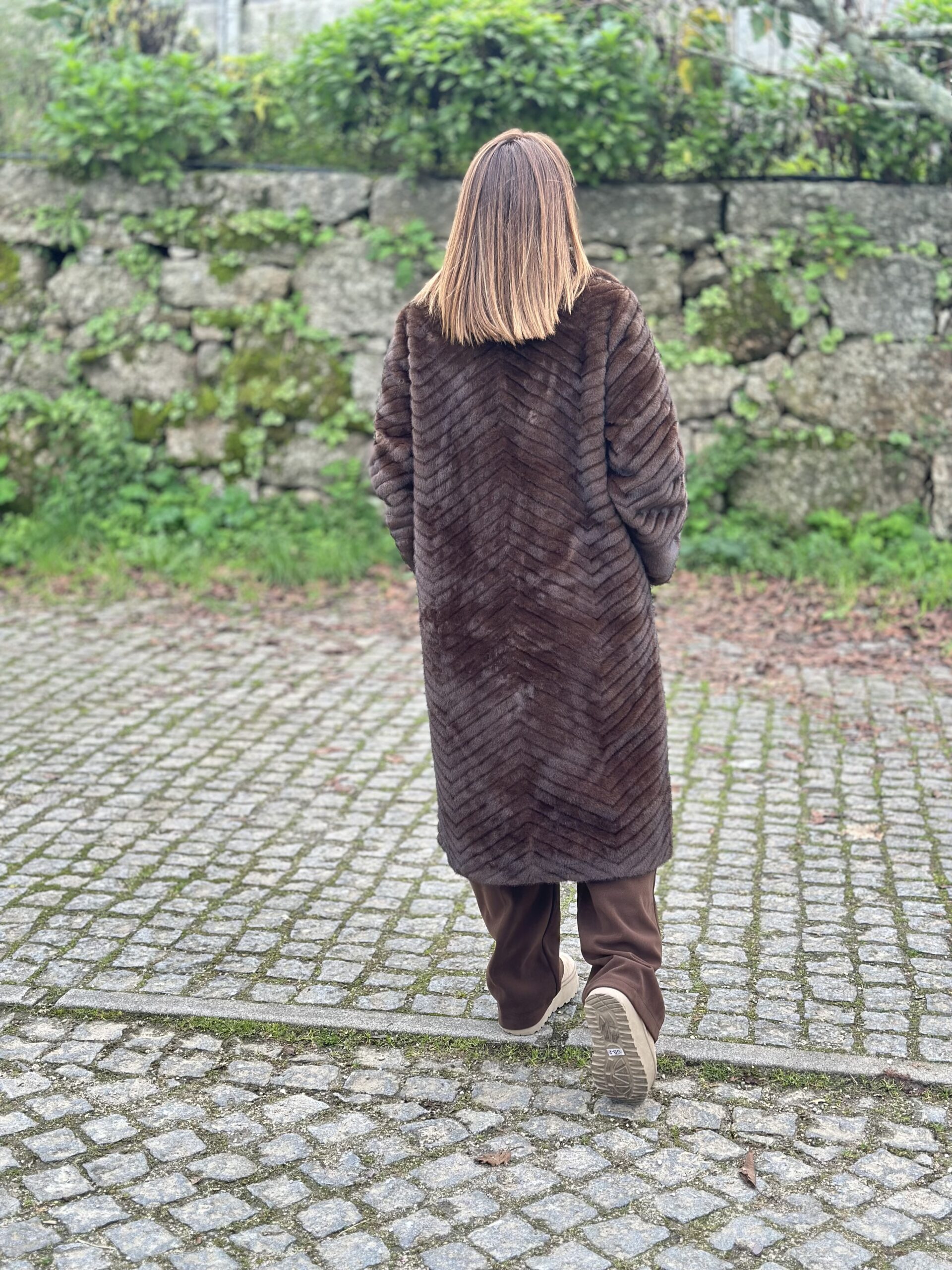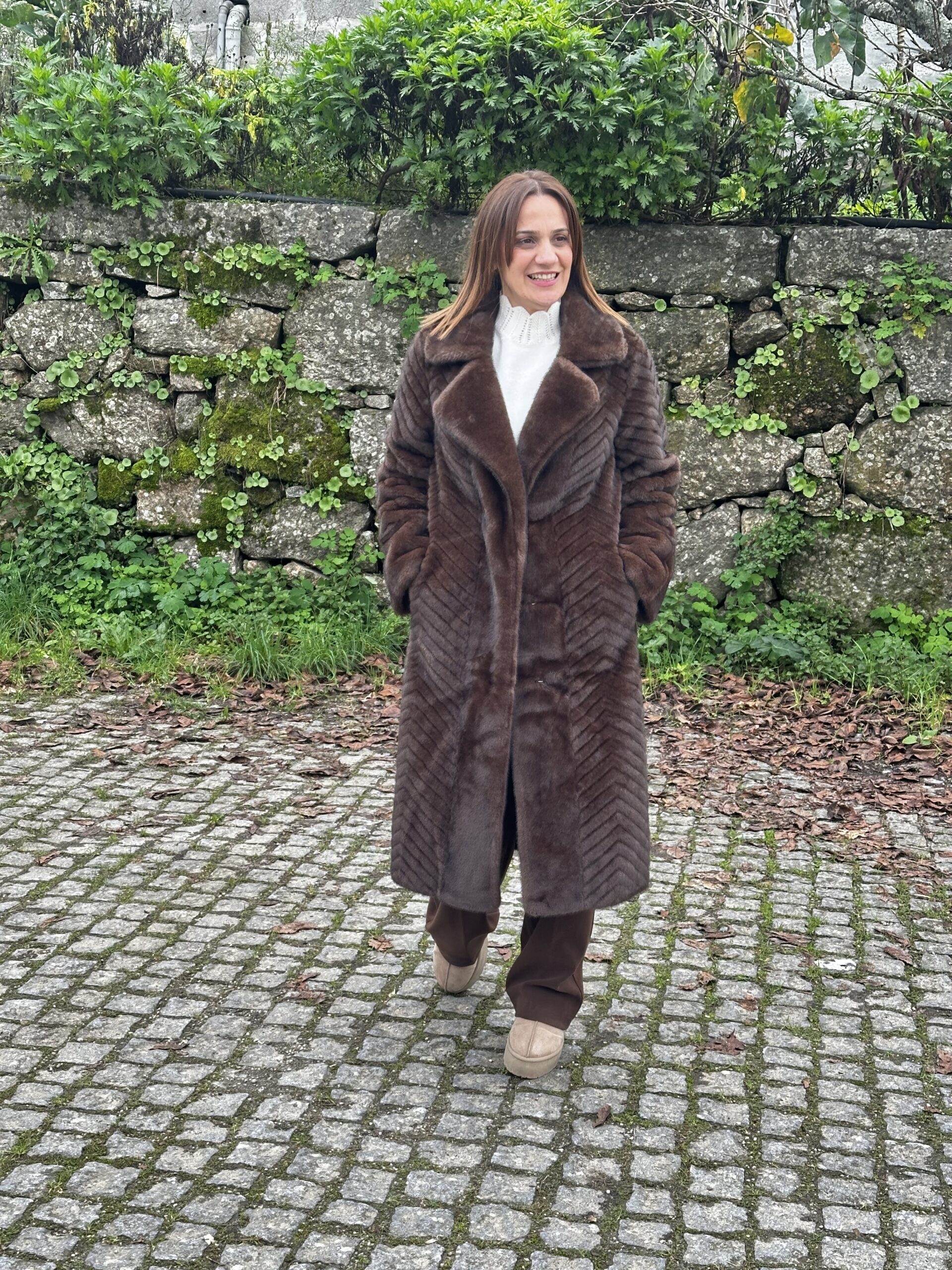 Overcoat Classy, o modelo apresenta forro tipo camurça, além de bolsos laterais, contém colchetes para fechar.