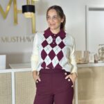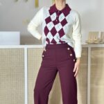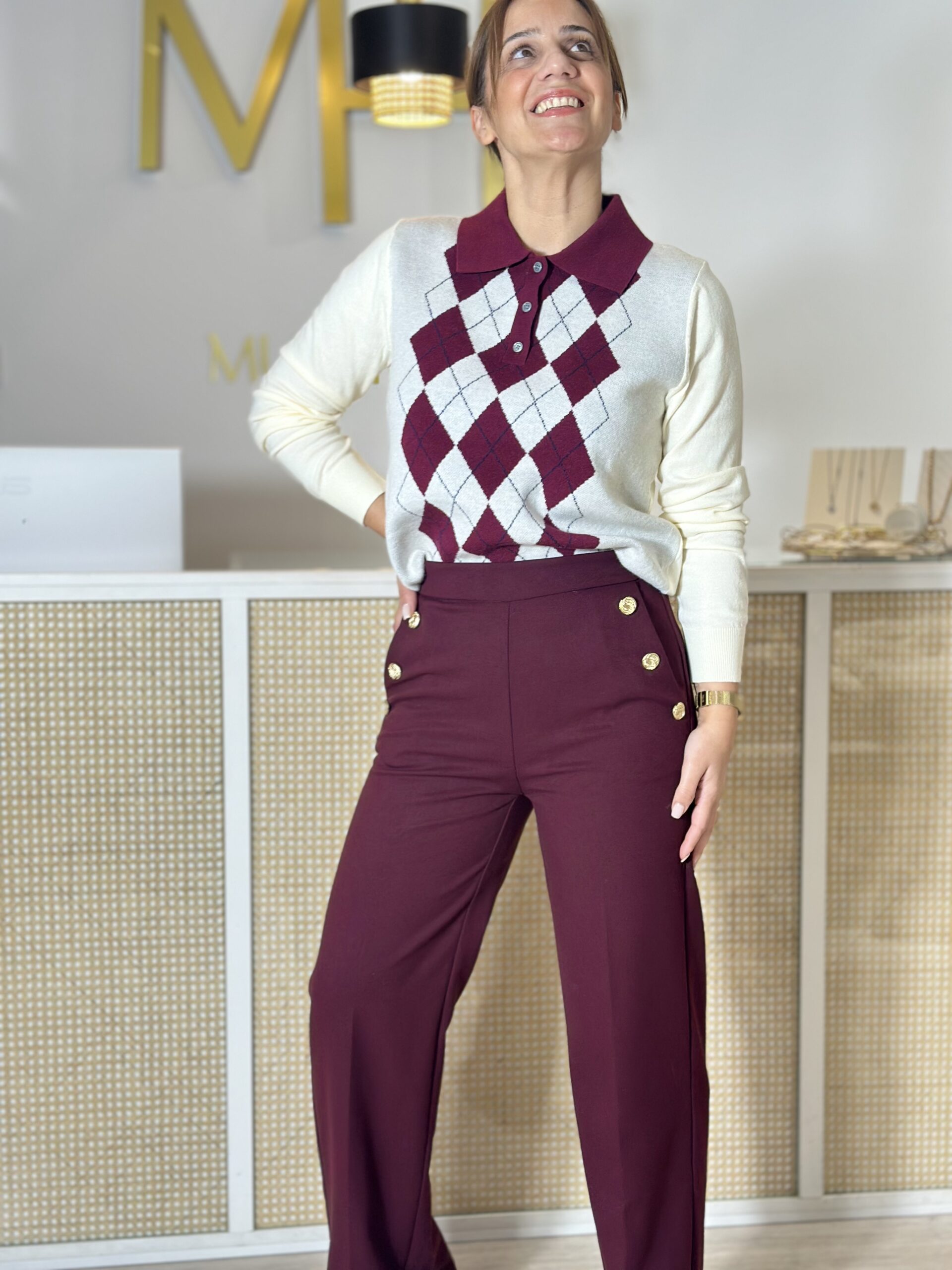 Polo malha com losangos parte frontal em tom de bordô.