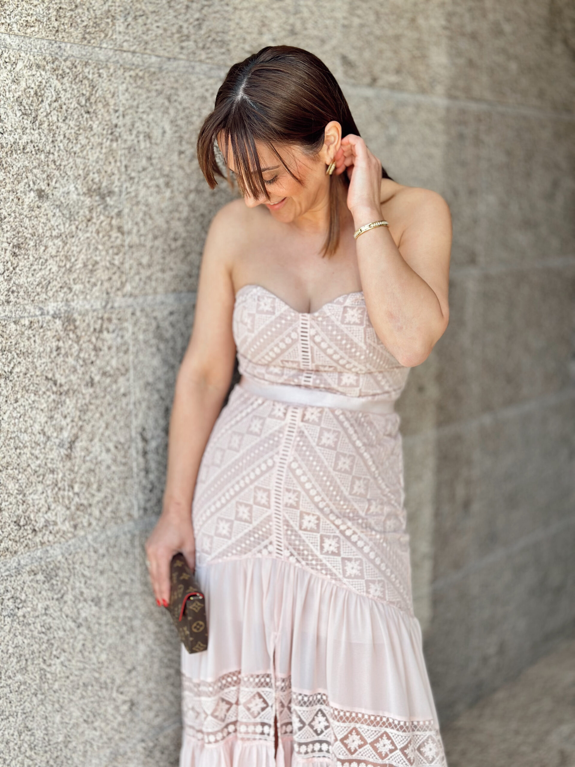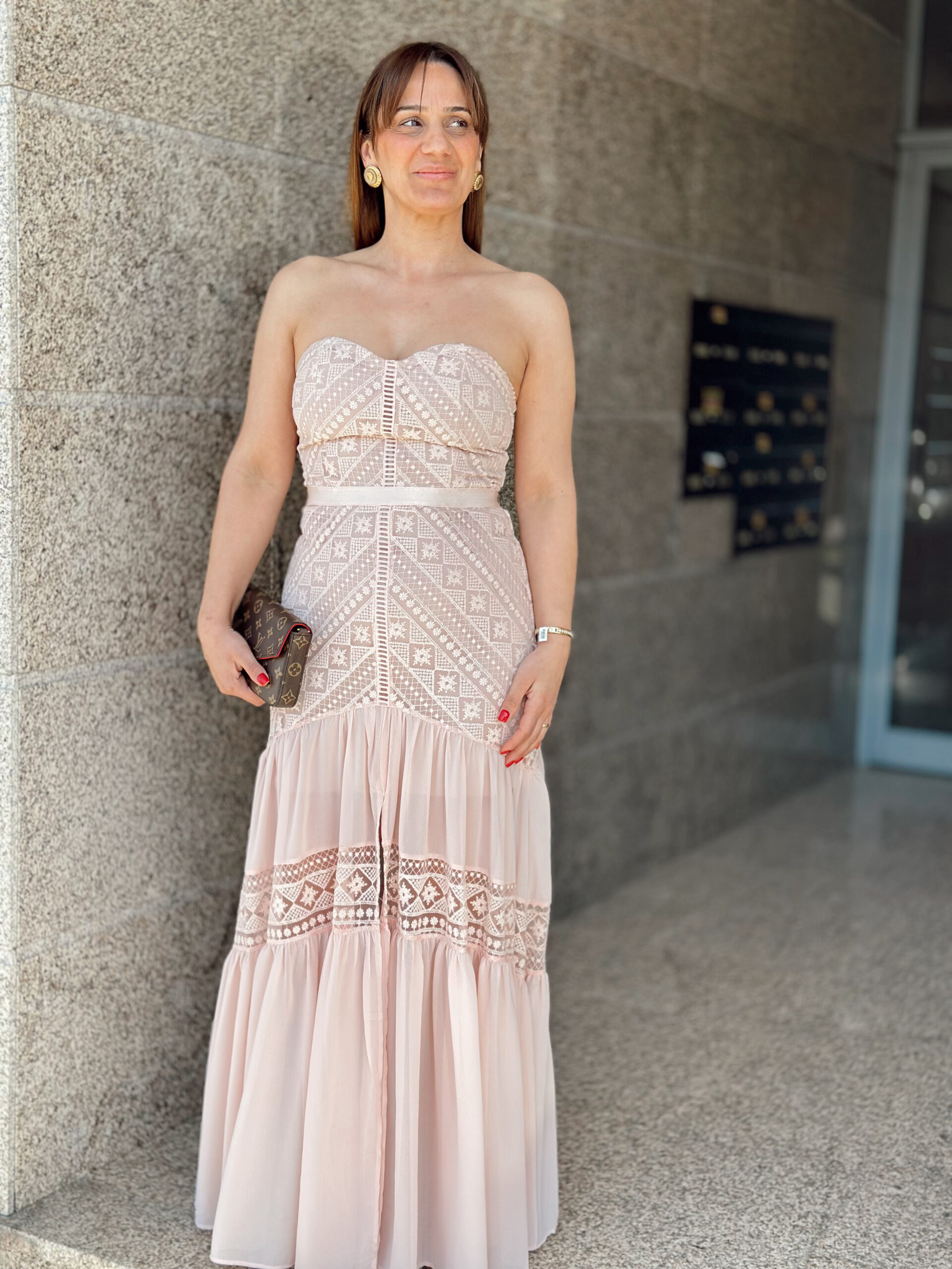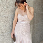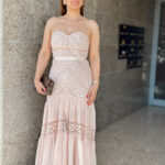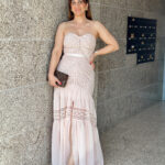 Vestido comprido em formato “cai cai”, com racha na parte frontal.