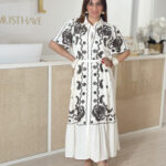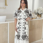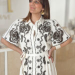 Vestido branco com bordado em castanho chocolate.