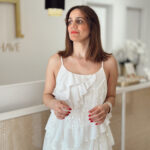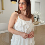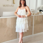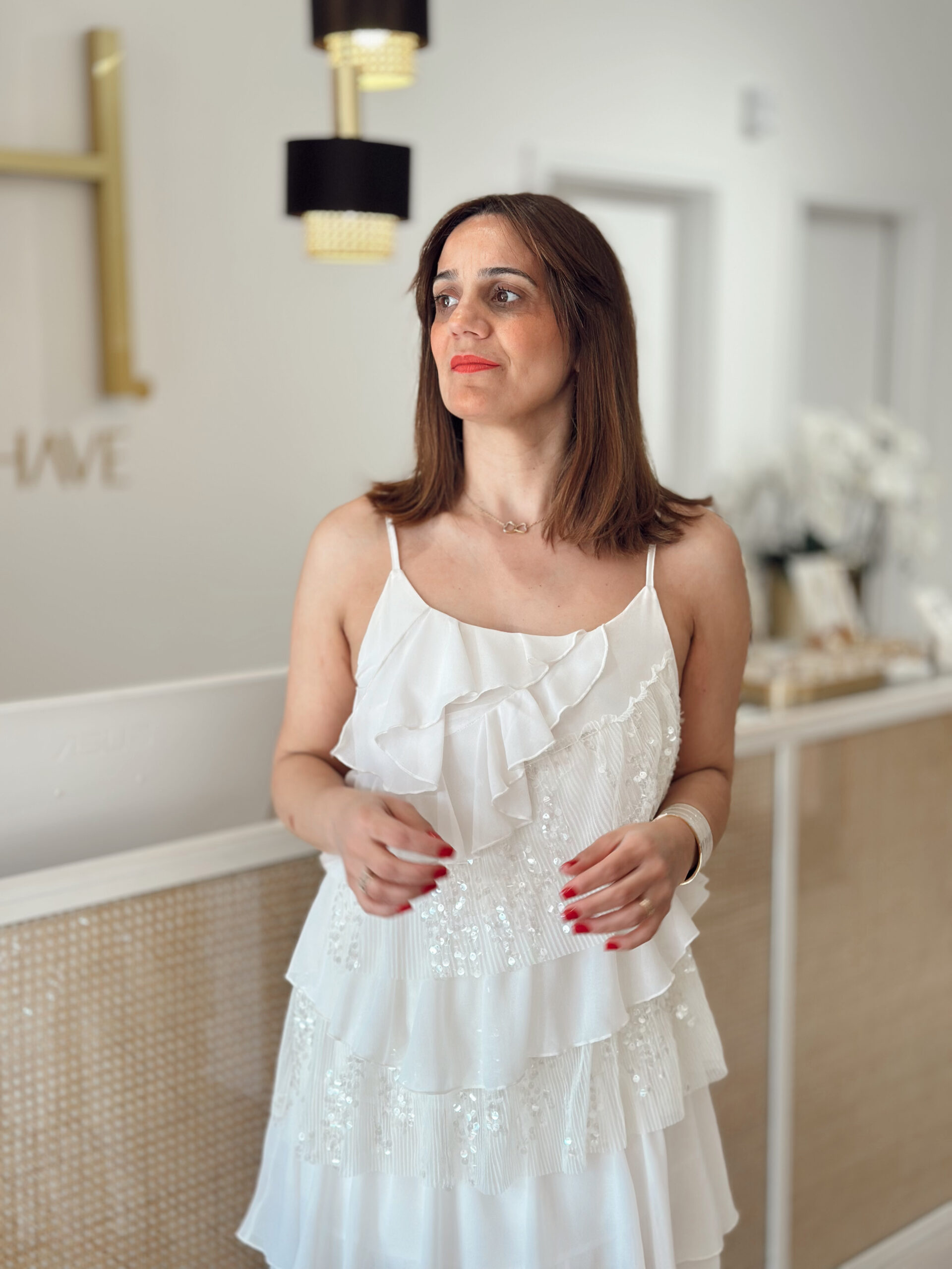 Vestido curto com folhos,contém pequenos tecidos com lantejoulas.